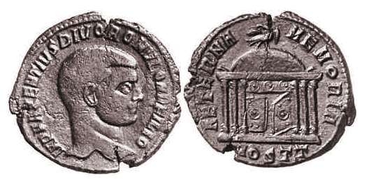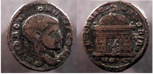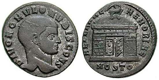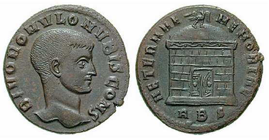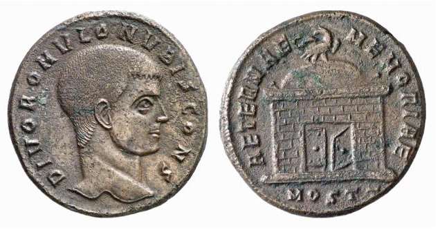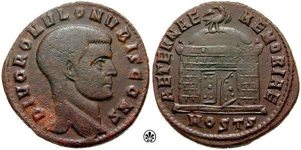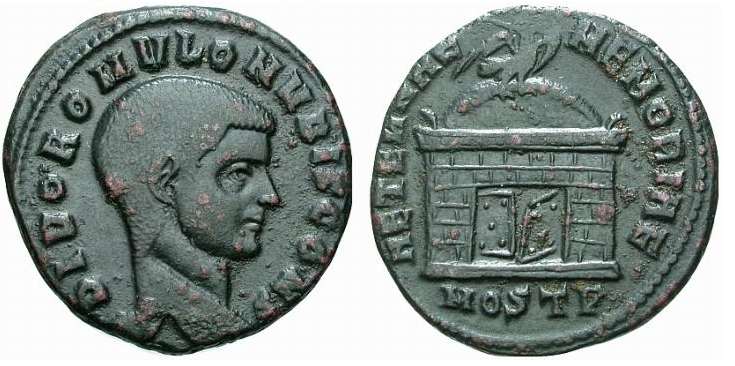 Ostia RIC 59, T | Divus Romulus AE Quarter-Follis. DIVO ROMVLO N V BIS CONS Head bare right / AETERNAE MEMORIAE, domed shrine with one door open, eagle standing right on roof. Mintmark MOSTT. RIC VI Ostia 59; Sear 15051. | Text | ![]() |