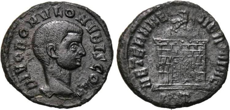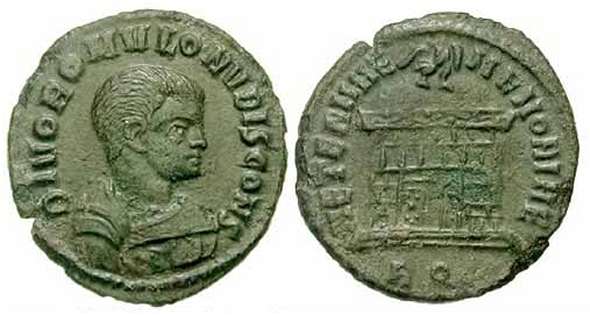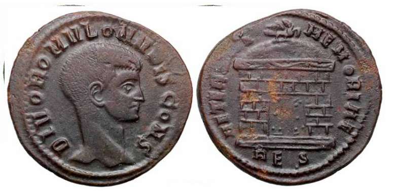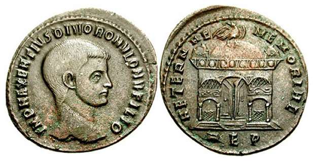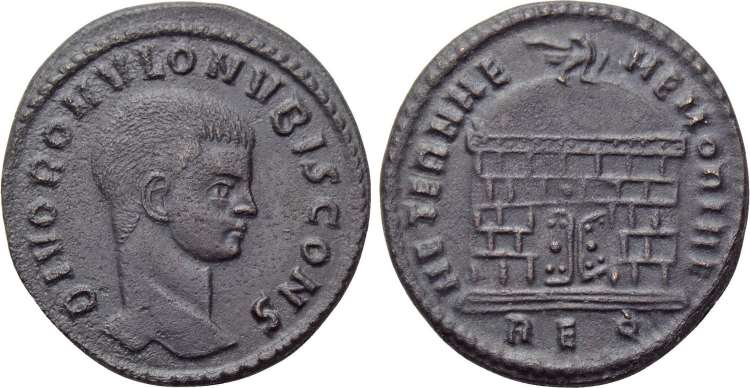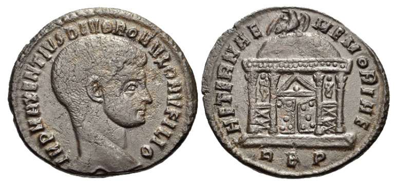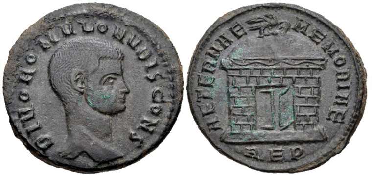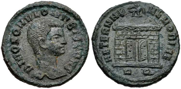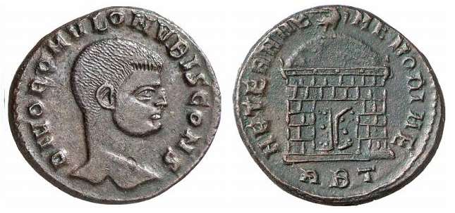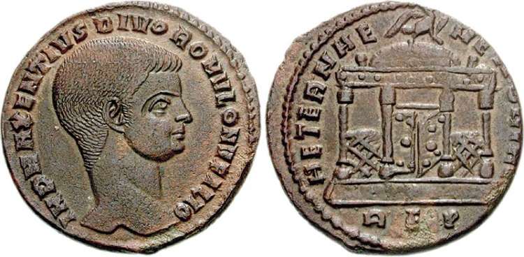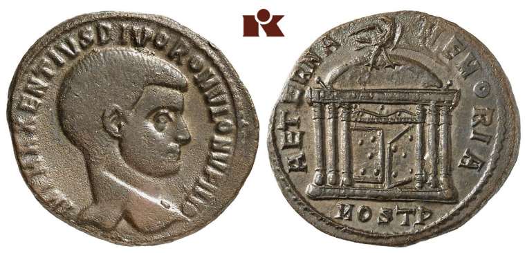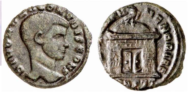 Ostia RIC VI 32 | Romulus, AE follis, Ostia. Posthumous issue, AD 309-312. DIVO ROMVLO NV FILIO MAXENTIVS AVG, bare head right. / AETERNAE-MEMORIA, domed, hexastyle shrine with right door ajar, all surmounted by eagle standing right, wings spread. Mintmark MOSTT. RIC VI Ostia 32. | Text | ![]() |