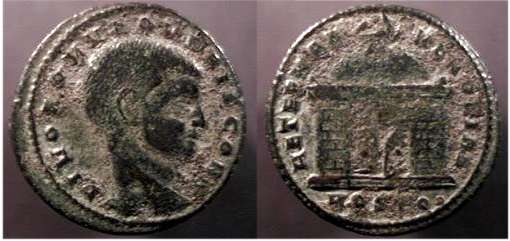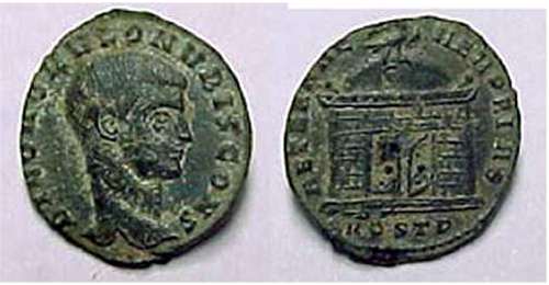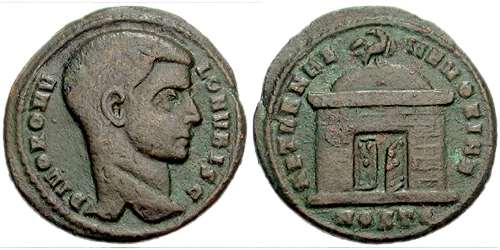 Ostia RIC 33, P | Divus Romulus. 309-312 AD. AE Follis. IMP MAXENTIVS DIVO ROMVLO NV FILIO, bare head right / AETERNAE-MEMORIA, Hexastyle temple with domed roof, right door open, roof surmounted by eagle standing right, looking back. Mintmark MOSTP. RIC VI Ostia 33; Sear 15045. | Text | ![]() |