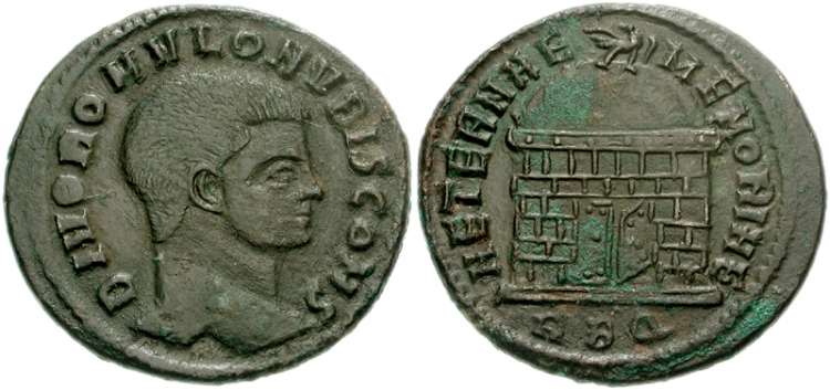 Rome RIC VI 256 | IMP MAXENTIVS DIVO ROMVLO NV FILIO, bare head right / AETERNAE MEMORIAE, hexastyle shrine with right door open, surmounted by eagle standing right. Mintmark REP. RIC VI Rome 256; Sear 15047. | Text | ![]() |