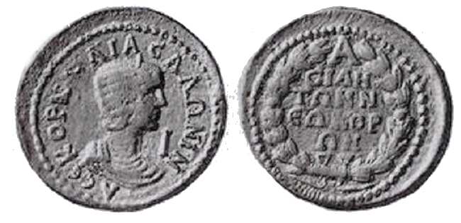 | Perga SNG Fr 588 | Salonina AE30 of Perga, Pamphylia. KOΡNEΛIA CAΛΩNINA CEB, draped bust right / ΠEΡΓAEΩN, Tyche standing left. | Text | Image |