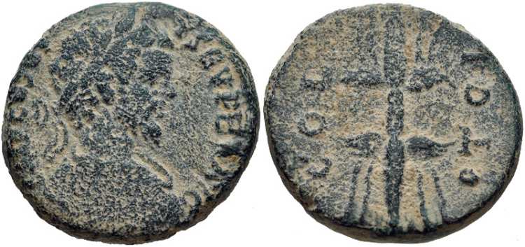 | Thessaly Koinon SGI 2134 | Septimius Severus AE27 mm of the Koinon of Thessaly. AVT Λ CEΠ CEBHΡOC, laureate head right / KOINON ΘECCAΛΩN, Athena Itonia standing right brandishing javelin and shield. | Text | Image |