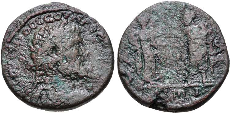 | Timbriada Naumann 94, 416 | Septimius Severus, AE25 of Timbriada, Pisidia. AD 193-211. 8.28 g. Magistrate M. Monnios. AY K Λ CEΠ CEYH, laureate, draped and cuirassed bust right. / TIMBΡIANΩN AΡX M MON-NI-OY, Kybele standing front, looking left, between two lions. Unpublished. Not in SNG von Aulock; von Aulock Pisidien; SNG Cop; BMC; SNG France; SNG Turkey 1-11; Mionnet etc. Naumann 94, 416. | Text | Image |