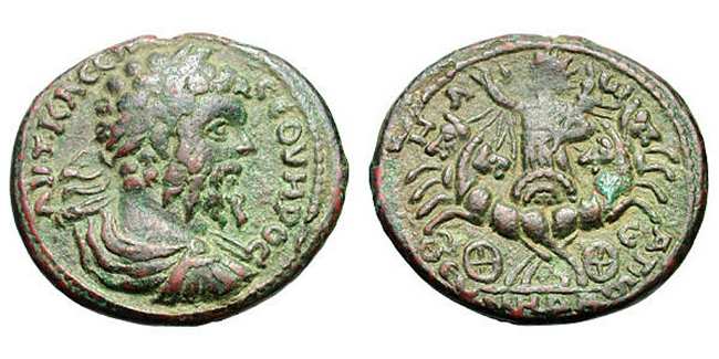 | Thyateira BMC 1915.603.45 | Septimius Severus, AE 29.5 gr. of Thyateira, Lydia. AD 193-211. Magistrate Asiatikos Hermogenos. AYT K Λ CEΠ CEOYHΡOC ΠEΡ, laureate, draped and cuirassed bust right / EΠI CTΡA ACIATIKOY EΡMOΓEN ΘYATEIΡHNΩN, Athena standing right, holding spear, facing Zeus, holding eagle and sceptre, standing left. BMC 1915,0603.45; GRPC Lydia 268. | Text | Image |