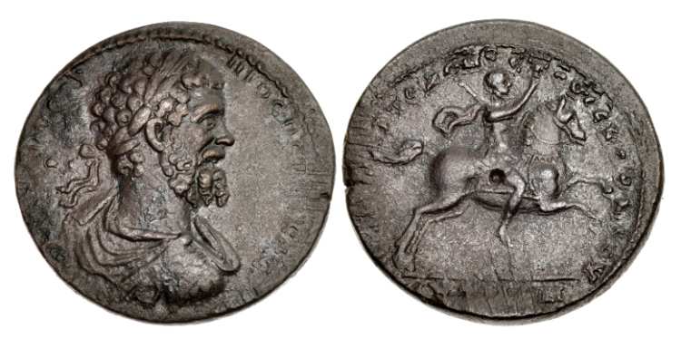 | Trapezus RecGen 16 | Septimius Severus, AE32 of Trapezus, Pontus. Dated local year 131, AD 198-199. 20.74 g. AYTO KAI Λ CEΠ CEYH CEΠT CEB, laureate, draped and cuirassed bust right. / TΡAΠEZOYNTIωN ETOYC AΛΡ around and below, Mithras on horseback riding right, tree to left, altar to right. RecGen 16; Wojan 33-34. | Text | Image |