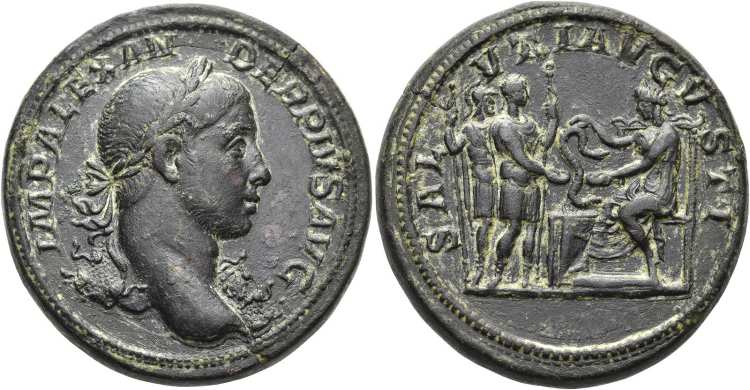 Cohen 536 | Severus Alexander, AE38 medallion, AD 222-235. 51.45 g). IMP ALEXANDER PIVS AVG, laureate head right, aegis on left shoulder. / SALVTI AVGVSTI, emperor standing right in military dress, holding spear, a soldier with spear at his side, both facing Salus seated left, holding patera, feeding a serpent entwined around an altar. Cohen 536; Gnecchi 27. | Text | Image |