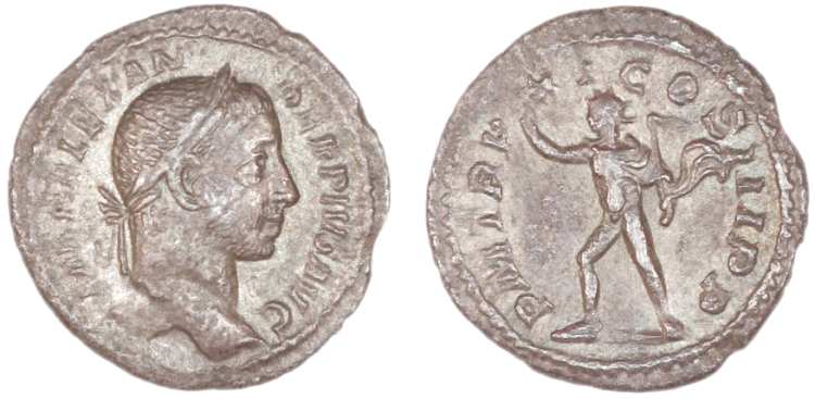 RIC 114c | Severus Alexander, AR denarius, Rome, 232 AD, 20 mm, 3.9 gr. IMP ALEXANDER PIVS AVG, Laureate, draped bust right / P M TR P XI COS III P P, Sol walking left, holding whip and raising right hand. RIC IV-2 114c. | Text | Image |