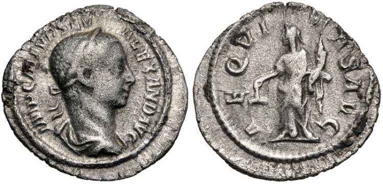 RIC 139 Sear 7864 | Severus Alexander Denarius. 225 AD. IMP C M AVR SEV ALEXAND AVG, laureate, draped and cuirassed bust right / FIDES MILITVM, Fides standing facing, head left, holding two legionary standards. RSC 52. | Text | Image |