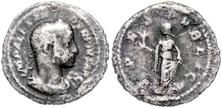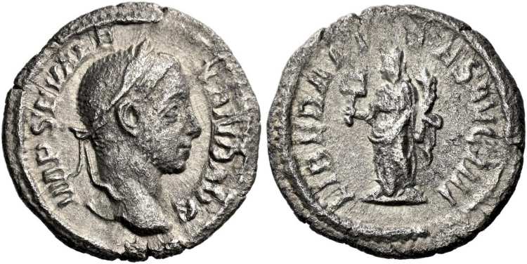 RIC 94 var | Severus Alexander, AR Denarius. AD 231. IMP ALEXANDER PIVS AVG, laureate, draped bust right / PM TR P X COS III PP, Annona standing left by modius, holding corn-ears over modius and anchor. RIC 94 var (date); RSC 370 var (ditto). | Text | Image |