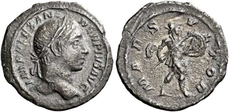 RIC 108 (1) | Severus Alexander, AR Denarius. AD 231. IMP ALEXANDER PIVS AVG, laureate head right / P M TR P X COS III P P, Mars standing left, holding spear and resting right hand on shield. RIC 108; RSC 409a; Sear -. | Text | Image |