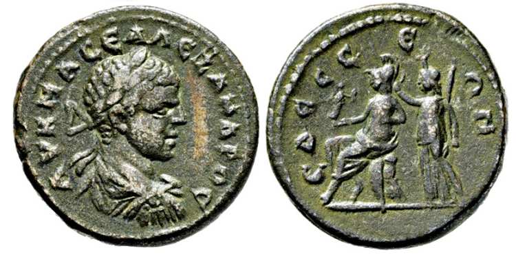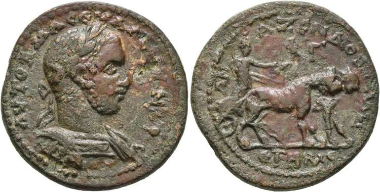 Syedra SNG Levante 417 | Severus Alexander AE32 of Syedra, Cilicia. AD 222-235. 23.49 g. A K M AYΡ CEOYHΡ AΛEXANΔΡOC CEB, Laureate, draped and cuirassed bust right / CYEΔΡEΩN, Ares standing facing, looking right, holding spear and parazonium. SNG Levante 417 (this coin); Reis 1. | Text | Image |