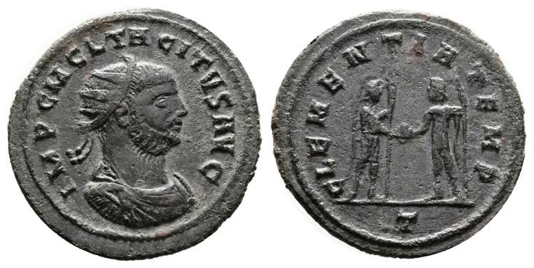 RIC 183v2 | Tacitus Silvered AE Antoninianus. Siscia mint. IMP C M CL TACITVS P AVG, radiate, cuirassed bust right / CONCORD MILIT, emperor standing right, clasping hand of Concordia, standing left. Mintmark XXIS. RIC 183 var. Unlisted bust type-legend-mintmark combination. | Text | ![]() |