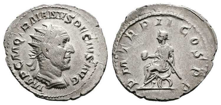 | RIC 8 | Traianus Decius, AR Antoninianus, AD 249. 5.0 g. IMP TRAIANVS DECIVS AVG, radiate, draped, cuirassed bust right / VIRTVS AVG, Virtus, helmeted, seated left on cuirass, holding branch and spear. RIC 8; RSC 123; Sear 9389. | Text | Image |