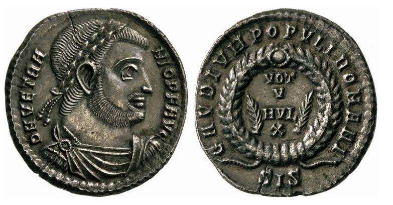 Siscia RIC VIII 261 | Vetranio, AR Heavy Miliarensis, 26mm, 4,99g. Siscia. 350 AD. DN VETRA-NIO PF AVG, laureate, draped, cuirassed bust right / GAVDIVM POPVLI ROMANI, VOT V MVL X within wreath, palm branch to left and right. Mintmark SIS. RIC VIII Siscia 261; RSC 2A; Sear 18898. | Text | Image |