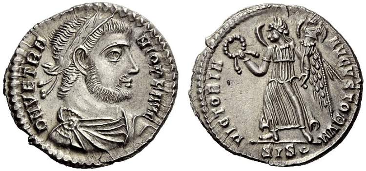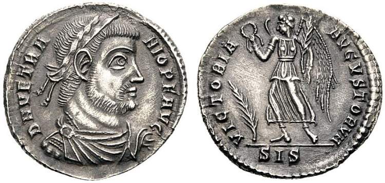 Siscia RIC VIII 263 | Vetranio, AR Light Miliarensis, Siscia. AD 350. DN VETRA-NIO PF AVG, laureate, draped, cuirassed bust right / VICTORIA AVGVSTORVM, Victory walking left, holding wreath and palm branch, palm branch angled \ in left field. Mintmark SIS wreath. RIC VIII Siscia 263; RSC 10b; Sear 18900. | Text | Image |