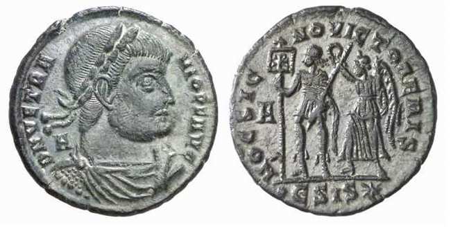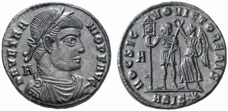 Siscia RIC VIII 287, Γ | Vetranio. 350 AD. AE3. DN VETRANIO PF AVG, laureate, draped and cuirassed bust right; A behind, star before / HOC SIG-NO VICTOR ERIS, Vetranio standing left, holding labarum and transverse sceptre, being crowned by Victory; A in left field, mintmark dot ΓSIS dot. RIC VIII Siscia 287; Sear 18905. | Text | Image |