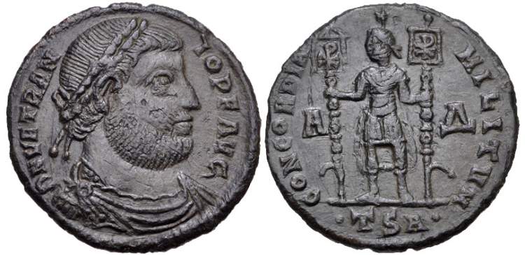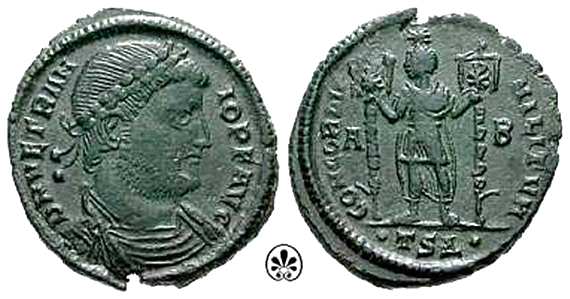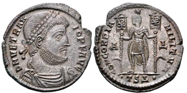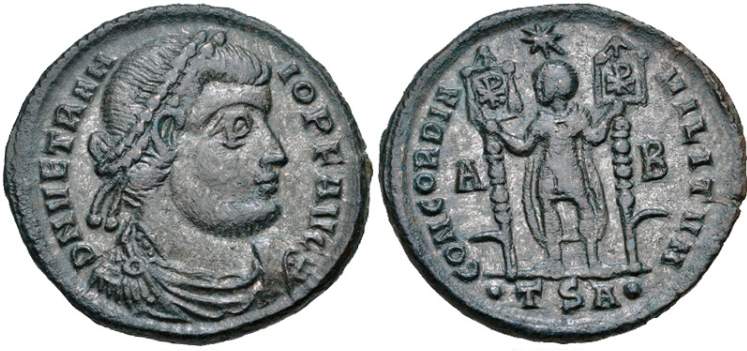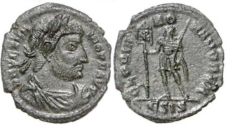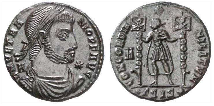 Siscia RIC VIII 285, Γ | Vetranio AE3. DN VETRANIO PF AVG, A behind bust, laureate, draped, cuirassed bust right, A behind head, star before / CONCORDIA MILITVM, emperor in military dress standing, holding labarum in each hand. A in left field, mintmark dot ΓSIS dot. RIC VIII Siscia 285; Sear 18903. | Text | Image |