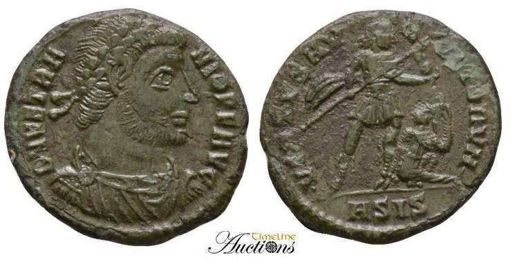 Siscia RIC VIII 296, A | Vetranio. AE3 of Siscia. DN VETRA-NIO PF AVG, Laureate, draped and cuirassed bust right / VIRTVS AVGVSTORVM, Emperor in military dress, standing right, holding transverse spear and globe and spurning a captive sitting at foot right, mintmark ASIS. RIC VIII Siscia 296; Sear 18908 | Text | Image |