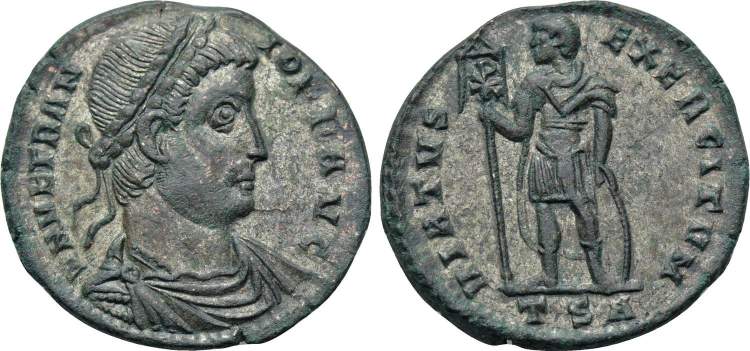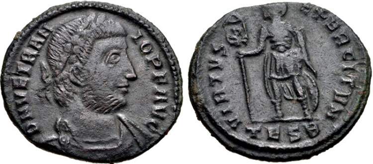 Thessalonica RIC VIII 138, A | Vetranio AE3. Thessalonica. AD 350. DN VETRANIO PF AVG laureate, draped and cuirassed bust right / VIRTVS EXERCITVM, Emperor standing front, looking left, holding labarum and resting hand on shield. Mintmark TESA. RIC VIII Thessalonica 138; Sear 18909. | Text | Image |