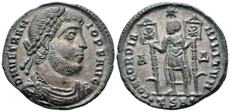 Thessalonica RIC 135, A | Vetranio AE3, Thessalonica Mint. AD 350. DN VETRANIO PF AVG, pearl diademed, draped, cuirassed bust right / CONCORDIA MILITVM, Emperor standing front, looking left, holding labarum in each hand. Star above head. A-Δ across fields. Mintmark dot TSA dot. RIC VIII Thessalonica 135; Sear 18904. | Text | Image |