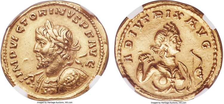 | RIC 13 var | Victorinus, AV aureus. Southern mint. AD 271. 21mm, 4.83 g. IMP VICTORINVS PF AVG, laureate head right / LEG II TRAIANA around, P-F across fields, Hercules, naked, standing front, looking right, lionskin over arm and resting right hand on club. RIC 13 var (obverse); Schulten 31. | Text | ![]() |