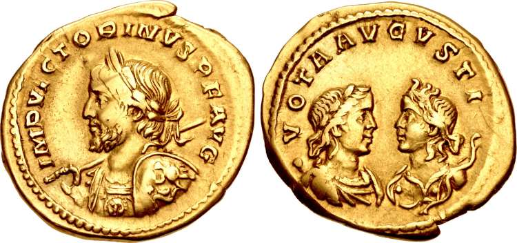 | RIC 33 | Victorinus. AV Aureus, AD 269-271. 20 mm, 4.62 g. Trier or Cologne mint. IMP VICTORINVS P F AVG, laureate and cuirassed bust left, aegis on chest, holding spear over right shoulder and shield on left arm. / VOTA AVGVSTI, laureate and draped bust of Apollo right, facing diademed and draped bust of Diana left, with bow against her shoulder. RIC V 33; Calicó 3854; Biaggi 1548. | Text | ![]() |