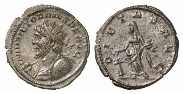 | Cunetio 2539 | Victorinus, AE antoninianus. 268-270 AD. IMP C VICTORINVS dot P dot F dot AVG, radiate, draped, cuirassed bust right / INVICTVS, Sol running left, holding whip, right hand raised, chlamys in two folds. Star in left field. Cunetio hoard 2539. | Text | ![]() |