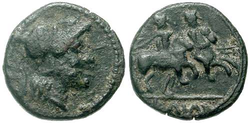 SNG ANS 680 | Apulia, Caelia. Circa 220-210 BC. AE 13mm. Helmeted head of Athena right / The Dioscuri on horseback right. | Text | Image |