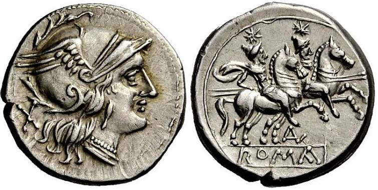 Aelia 1 | Aelius. AL series AR Denarius. 211-208 BC. 4.03 g. Mint in Central Italy. Head of Roma right, X behind head. / The Dioscuri on horseback galloping right, AL ligate and ROMA in partial linear frame below. Crawford RRC 111/1; Syd. 276; Aelia 1. | Text | Image |