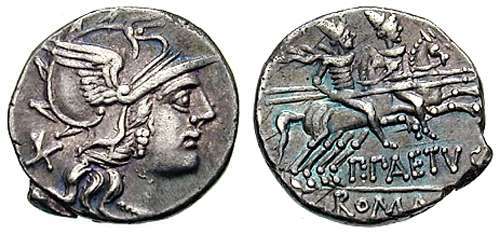 Aelia 3 Sear5 110 | P Aelius Paetus Denarius. 138 BC. Helmeted head of Roma facing right, X behind head / The Dioscuri galloping right, P PAETVS below, ROMA in ex. Syd 455, Cr233/1. | Text | Image |