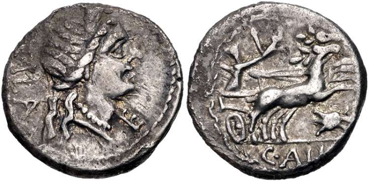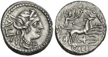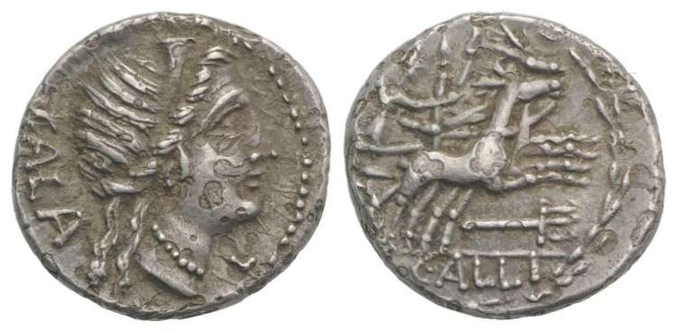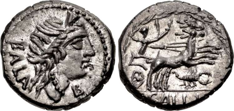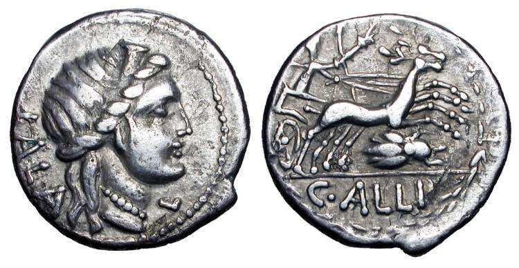 Aelia 4 Sear5 221 | C Allius Bala Denarius. 92 BC. Diademed head of Diana right, letter beneath chin / Diana in biga of stags right, holding sceptre and torch, control symbol below, C ALLI in ex, within laurel wreath. Crawford 336/1b; Syd 595. (Various letters/combinations on the Sear page here). | Text | Image |
