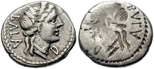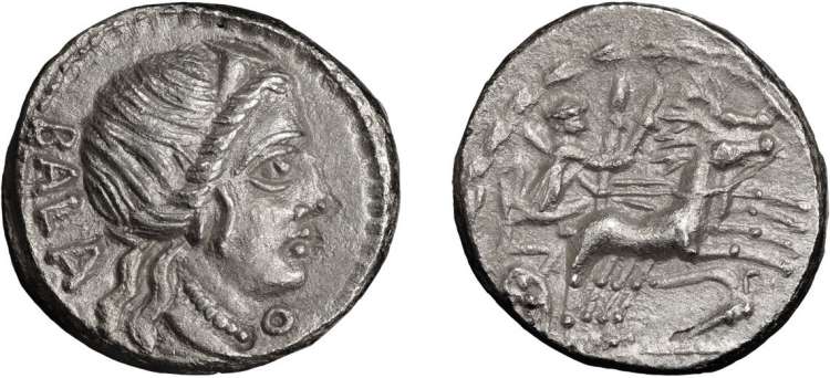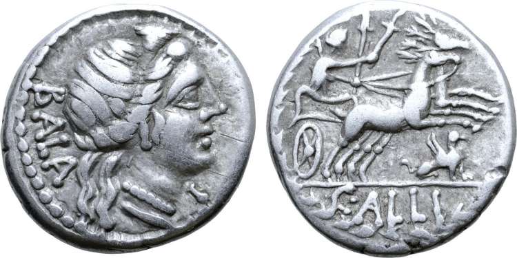 Aelia 4 Cr 336, 1a | C. Allius Bala. AR Denarius. 92 BC. 17 mm, 3.89g. BALA behind Diademed head of Diana right; no letter beneath chin. / Diana in biga of stags right, holding sceptre and torch; grasshopper below. C.ALLI in ex. Crawford 336/1a; Sydenham 595; Aelia 4. | Text | Image |