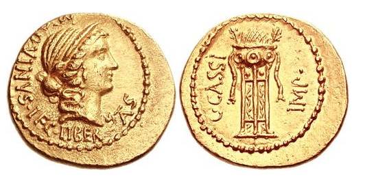 | Cassia 12 | C. Cassius with M. Aquinus. AV Aureus, mint moving with Cassius 43-42, 8.03 g. M AQVINVS LEG LIBERTAS, diademed head of Libertas right / C·CASSI PR·COS, Tripod surmounted by cauldron, decorated with two laurel branches, fillets hanging to right and left. Cassia 12; Cohen 2; Bahrfeldt 56; Sydenham 1302; Sear Imperators 217; Crawford 498/1; Calicó 63. | Text | Image |