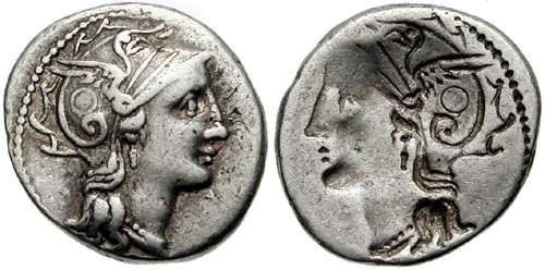 Claudia 1cf | C Claudius Pulcher AR Brockage Denarius. Helmeted head of Roma right / incuse of obverse.