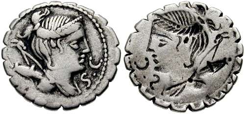 Claudia 5cf | Ti Claudius Ti f Ap f Nero. 79 BC. AR Brockage Serrate Denarius. Draped bust of Diana right, bow and quiver over shoulder / incuse of obverse.