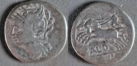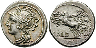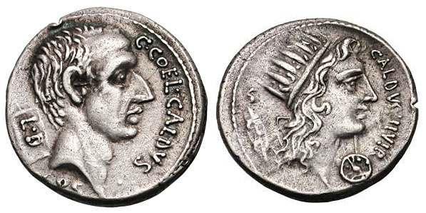 | Coelia 5 | C Coelius Caldus AR Denarius. 51 BC. Rome mint. C COEL CALDVS before, COS below, bare head of C Coelius Caldus right, L D on tablet behind / CALDVS III VIR before, radiate head of Sol right; behind, S above oval shield ornamented with thunderbolt; round shield below chin. Cr437/1b, Syd 892.
