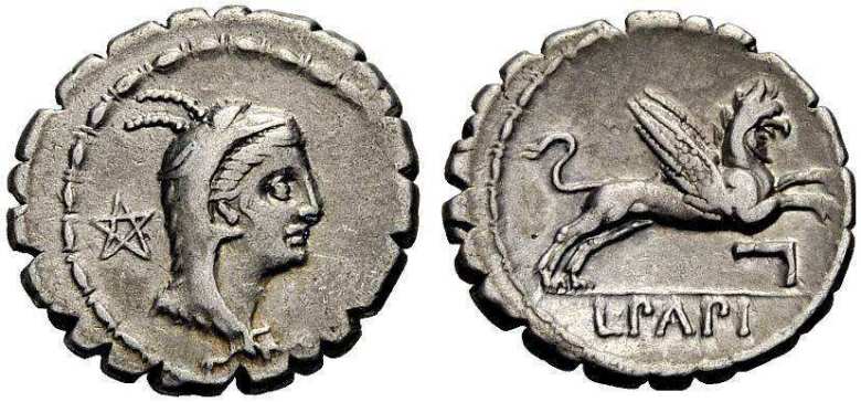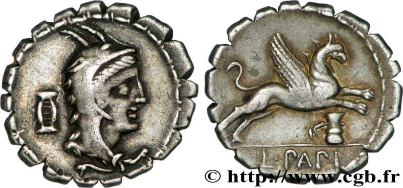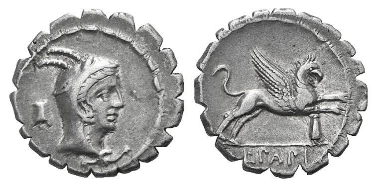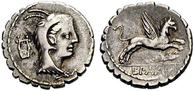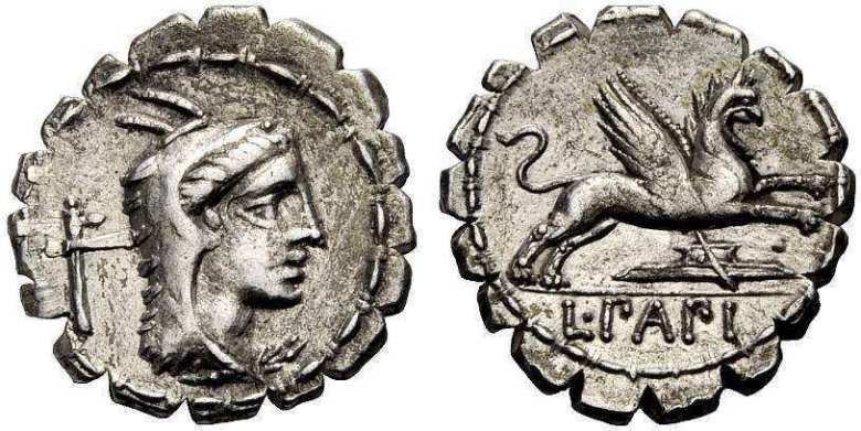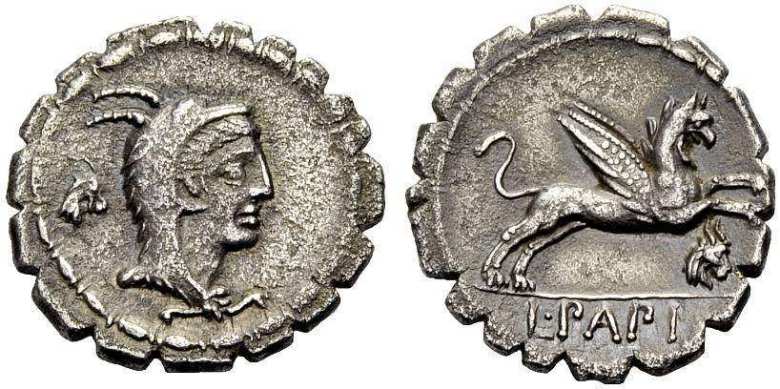 | Papia 1 Sear5 311 | L Papius Denarius Serratus. 79 BC, Head of Juno Sospita right, wearing goatskin, symbol behind / Gryphon springing right, symbol below, L PAPI in ex. Syd 773, Cr384/1. | (1 example) | |