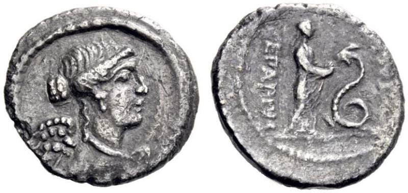 | Papia 4 | L. Papius Celsus, AR Quinarius 45, 1.45 g. Bust of winged Victory right / L·PAPIVS – [CELSVS], Girl standing right, feeding upright serpent. Babelon Papia 4; RSC 4; Syd. 966; Sear Imperators 84; Crawford 472/3. | Text | Image | |