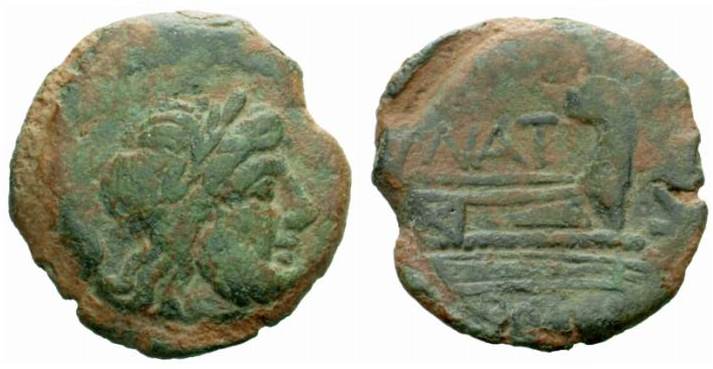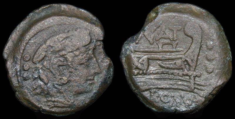 | Pinaria 4 | Pinaria, AE Semis, 200 BC. Laureate head of Jupiter right, S behind head / NAT above prow right, S to right, ROMA below. Pinaria 4; Crawford 200/3, Syd 383a; Sear 848. | Text | Image |