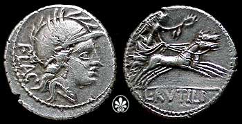 | Rutilia 1a | L. Rutilius Flaccus. 77 BC. AR Denarius. L Rutilius Flaccus Denarius. 77 BC. Helmeted head of Roma right, FLAC behind / Victory in biga right, L RVTILI in ex. Syd 780a. | Text | Image | |
