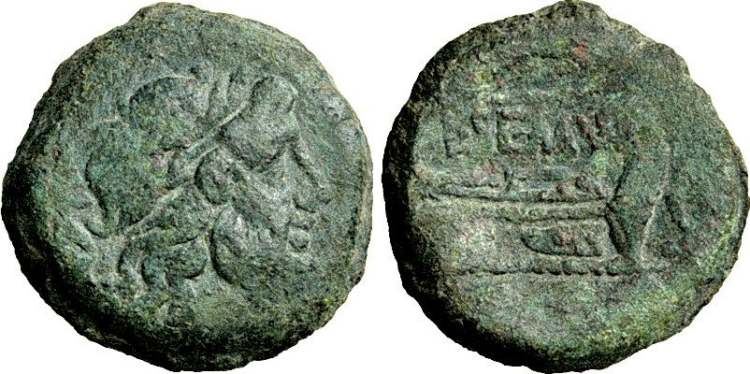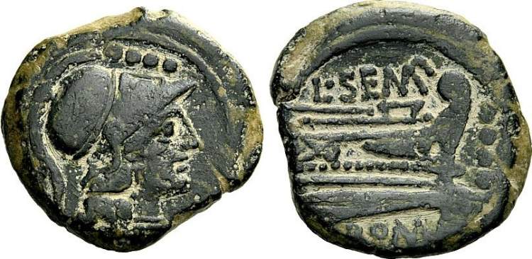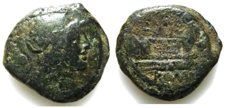 | Sempronia 8 | Roman Republic, AE Quadrans 18mm; 5.8g. Anonymous issue. Head of Herakles right, wearing lionskin, three dots (value) left / L.SEMP above prow right; three dots before; ROMA beneath. Crawford 219; Babelon Sempronia 8. | Text | Image | |