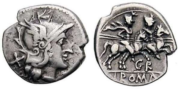 | Sempronia 1 | Gracchus AR Denarius. 199-170 BC. Helmeted head of Roma right, X behind head / The Dioscuri riding right, GR below, ROMA in exergue. Cr169/1; BMCRR Italy 358 and 362. | Text | Image | |