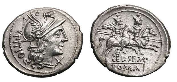 | Sempronia 2 Sear 91 | L Sempronius Pitio Denarius. 148 BC. PITIO behind helmeted head of Roma, right / The Dioscuri riding right, holding couched lances, L SEMP below, ROMA in ex. Cr216/1. | Text | Image | |
