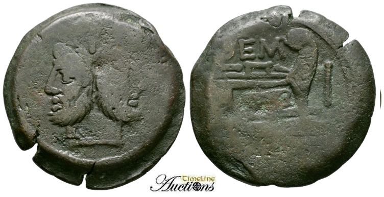 | Sempronia 4 | B. Sempronia AE As. 148 BC. Rome. Laureate head of Janus, I above / L SEMP above prow right (MP ligate), I to right, ROMA below. Crawford 216/2b; Sempronia 4. | Text | Image | |