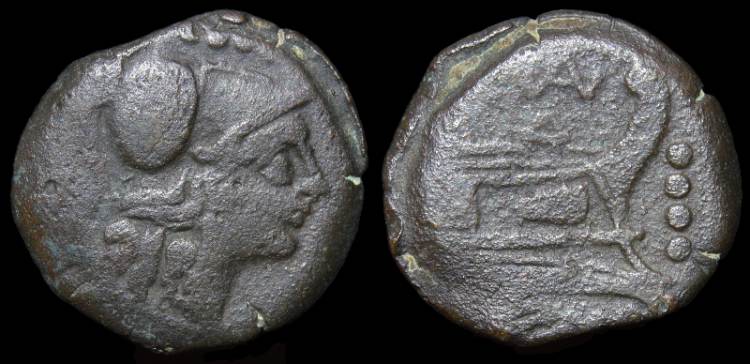 | Valeria 3 | Roman Republic AE Triens, 21mm, 7.29 g, "VAL" series(Valerius), 169-158 BC. Helmeted head of Minerva right, oooo above / Prow right with peaked deck structure; VAL monogram above; oooo to right; ROMA below. Valeria 3; Crawford 191/3. Syd. 356b. | Text | Image |