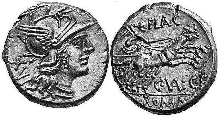 Valeria 8 Sear5 104 | C. Valerius Flaccus. AR Republican Denarius. 140 BC. Helmeted head of Roma right, XVI behind / FLAC above, Victory in galloping biga, C VAL C F below. Valeria 8; Sydenham 440; Crawford 228/2. | Text | Image |