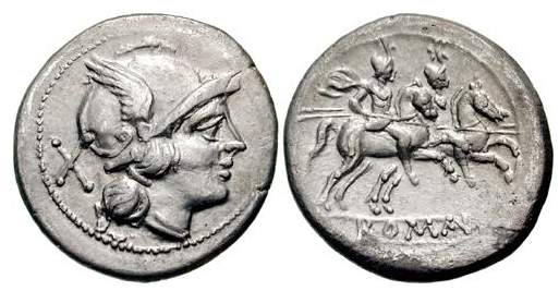 Anonymous AR Denarius of the Roman Republic. After 211 BC. Helmeted head of Roma right, with triple earring, spike above visor, X behind. / The Dioscuri riding right, ROMA in linear frame below. Syd 168, Cr53/2.