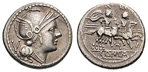 Anonymous AR Quinarius. 211-207 BC. Head of Roma right, V behind / Dioscuri riding right, H below horses, ROMA in linear frame in ex. Babelon 22 (gens Hatria?); Cr85/1a, Syd 174a.
