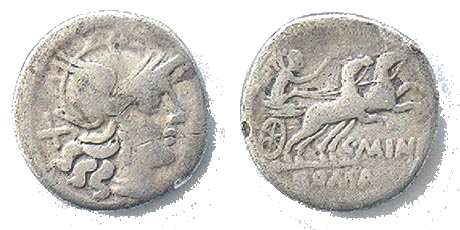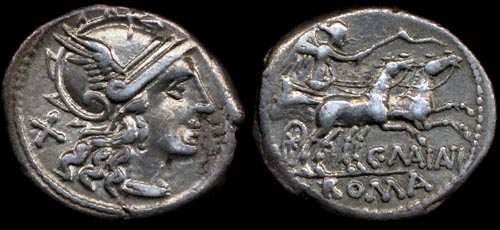 C Maianius Denarius. 153 BC. Helmeted head of Roma right, X behind / Victory in biga right, C MAIANI below, ROMA in ex. Crawford 203/1a, Syd 427.