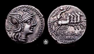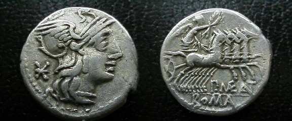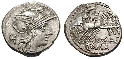 P Maenius Antiaticus M f Denarius. 132 BC. Helmeted head of Roma right, X behind / Victory in quadriga right, P MAE ANT (ligate) below, ROMA in ex. Cr249/1, Syd 492.
